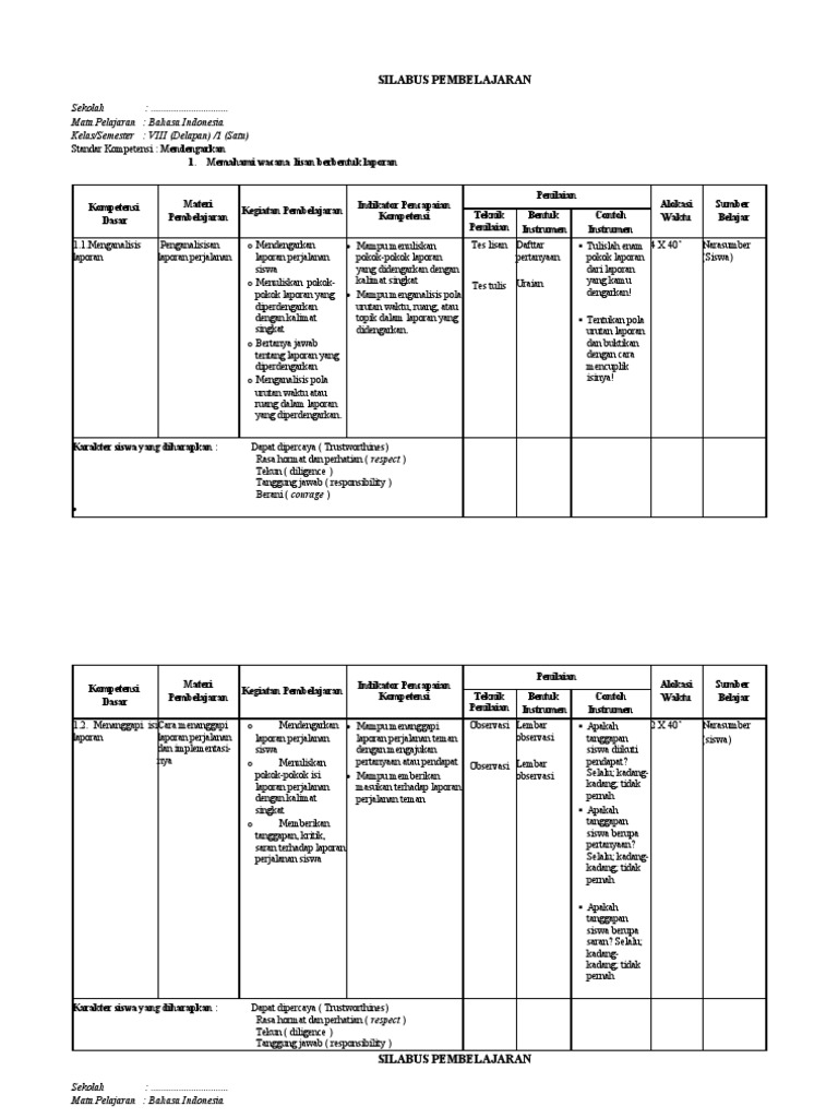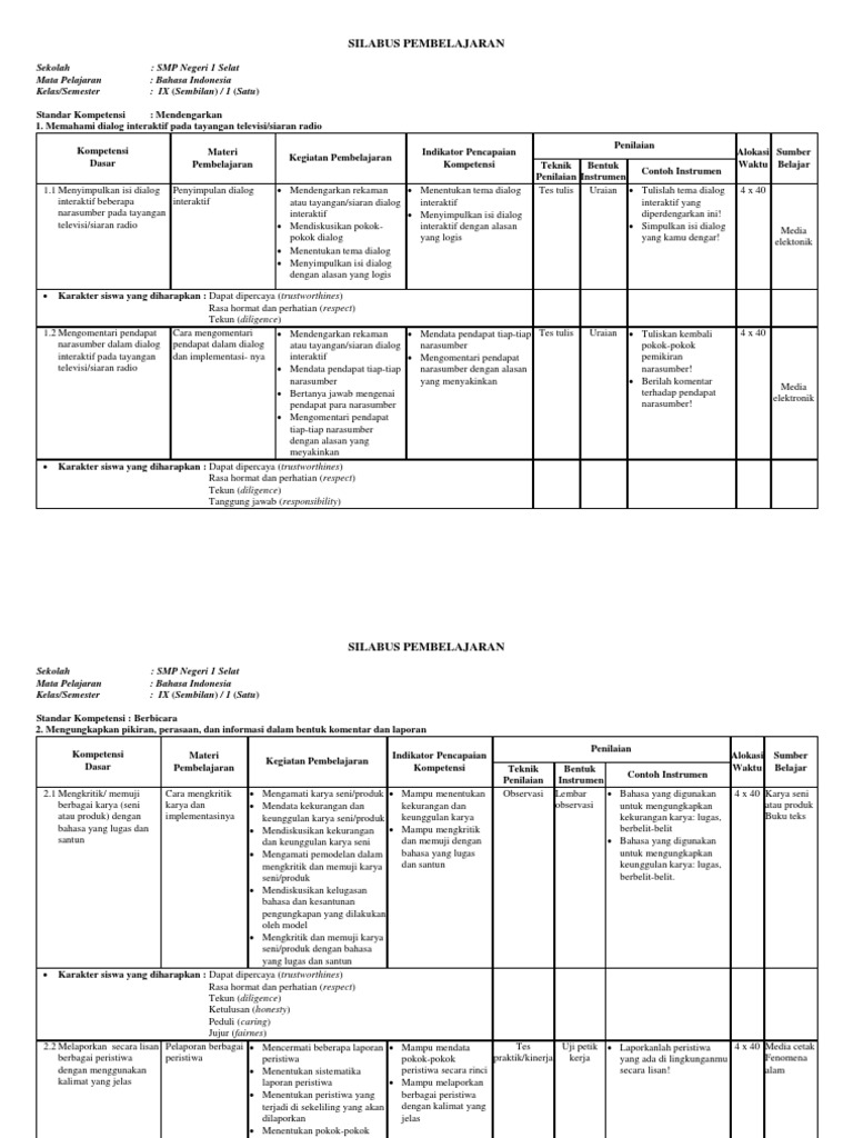 Model silabus bahasa indonesia kelas viii k13 terbaru ini berdasarkan model silabus mata pelajaran sekolah menengah pertama/ madrasah tsanawiyah (smp/mts) mata pelajaran bahasa indonesia yang diterbitkan kementerian pendidikan dan kebudayaan tahun 2017. Bagi seorang guru perangkat pembelajaran merupakan sebuah dokumen yang sangat penting untuk dimiliki demi kelancaran proses pembelajaran. Untuk diketahui kurikulum 2013 merupakan pengganti dari kurikulum tingkat satuan pendidikan yang pada pelaksanaan menekankan tiga aspek penilaian, yaitu aspek pengetahuan, aspek keterampilan, dan aspek sikap dan perilaku. Baiklah berbicara mengenai silabus maka tentunya tidak terlepas dengan yang namanya perangkat pembelajaran yang sangat di perlukan oleh. Perangkat pembelajaran khususnya silabus merupakan perangkat pembelajaran yang sangat penting bagi seorang guru mata pelajaran. Silabus terbaru edisi tahun 2018 pengembangan oleh guru zuhri indonesia. Soal bahasa indonesia kelas 8 semester 2 genap berilah tanda silang x pada huruf a b c atau d di depan jawaban…. Pedoman umum ejaan yang disempurnakan. Berikut ini rpp, silabus, prosem, prota, kkm, sk&kd, smp kurikulum 2013 kelas 7, 8 , 9 lengkap revisi 2016 sebagai perangkat pembelajaran dalam proses kegiatan belajar mengajar Contoh silabus k13 smp bahasa indonesia guru ilmu sosial. 8.1 menulis kreatif naskah drama satu babak dengan memperhatikan keaslian ide indikator : Menunjukan prilaku jujur, disiplin, tanggung jawab, peduli (toleransi, gotong royong), santun, dan percaya diri dalam berinteraksi secara efektif dengan lingkungan sosial dan alam dalam jangkauan pergaulan. Download bahasa indonesia smp kelas 8 semester 2 terbaru disini.